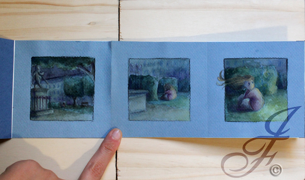 Petit livret-accordéon de treize images, avec un format carré de dix centimètres de côté.